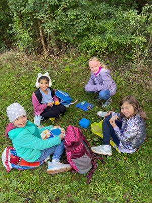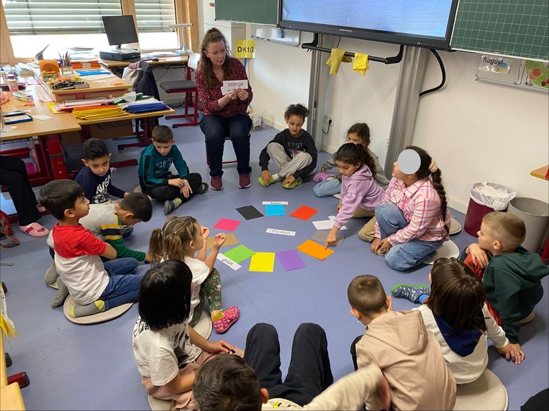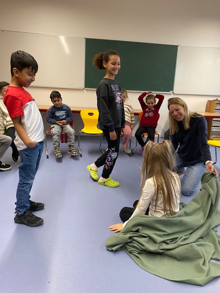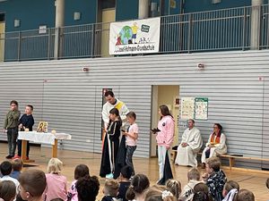Der Schulgottesdienst fand in der Turnhalle statt und wurde von Frau Tobias, Herrn Hirschberger und Herrn Schmola gestaltet. Dabei legten die Kinder ihre Sorgen als schwarze Tücher nieder und überdeckten sie mit bunten Papierstreifen, sodass am Ende ein farbenfrohes Kreuz entstand, das an das Kreuz Jesu erinnerte..